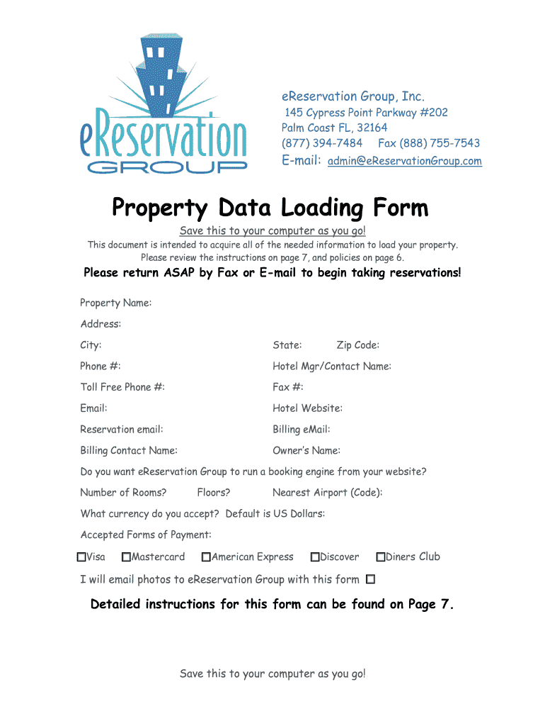 The Property Data Loading Form is a crucial tool designed for property owners to submit detailed information about their properties to eReservation Group. This form plays an essential role in facilitating the setup of a booking engine, ensuring that property owners can effectively manage reservations.