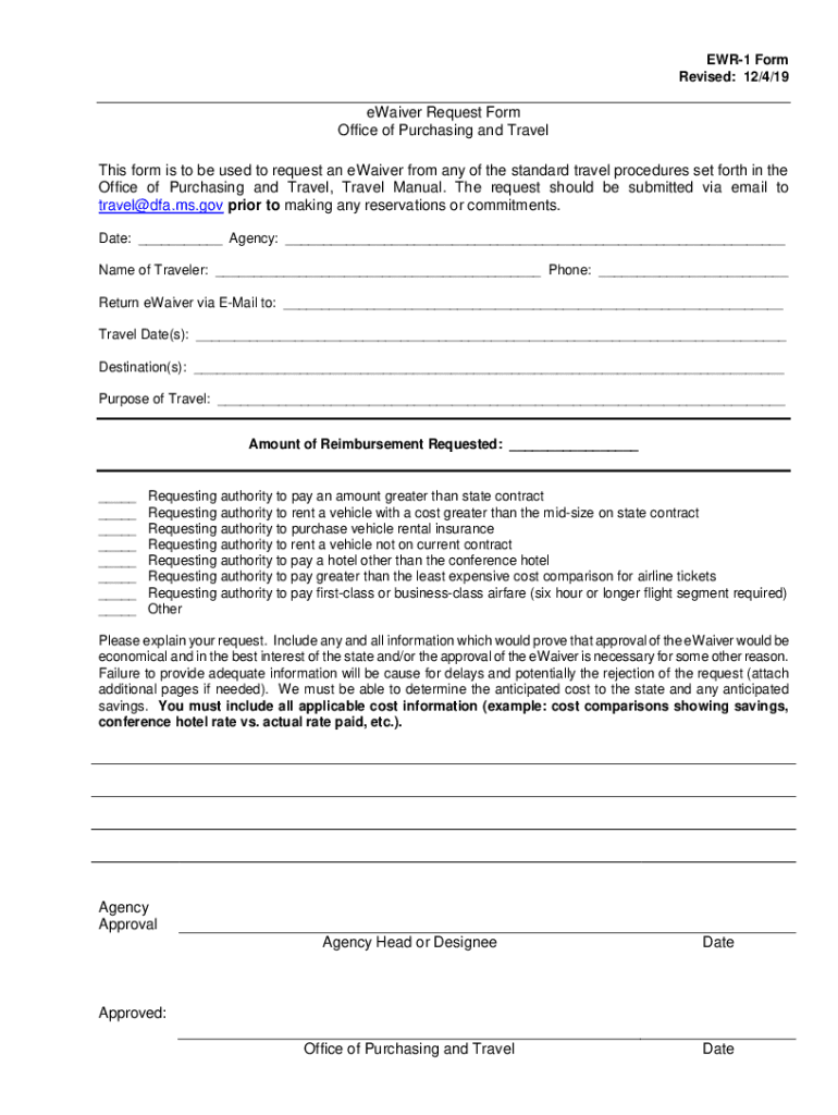 EWR1 Form Revised: 12/4/19eWaiver Request Form Office of Purchasing and Travel This form is to be used to request a waiver from any of the standard travel procedures set forth in the Office of Purchasing