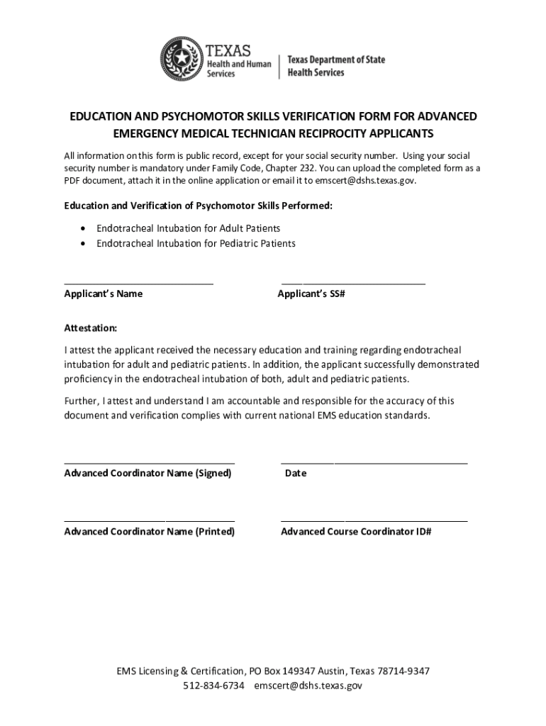 EDUCATION AND PSYCHOMOTOR SKILLS VERIFICATION FORM FOR ADVANCED EMERGENCY MEDICAL TECHNICIAN RECIPROCITY APPLICANTS All information on this form is public record, except for your social security number.