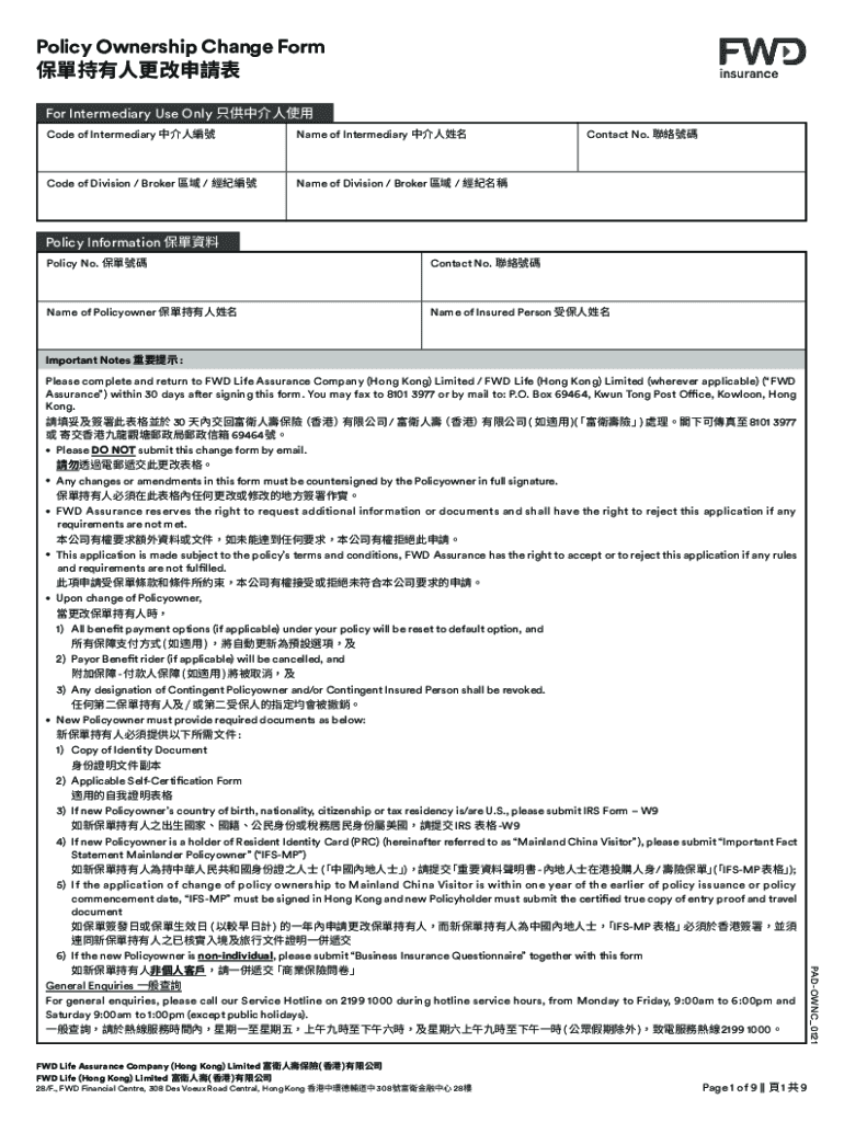 Policy Ownership Change Form For Intermediary Use Only Code of Intermediary Name of Intermediary Code of Division / Broker / Name of Division / Broker / Policy Information Contact No. Policy No. Contact