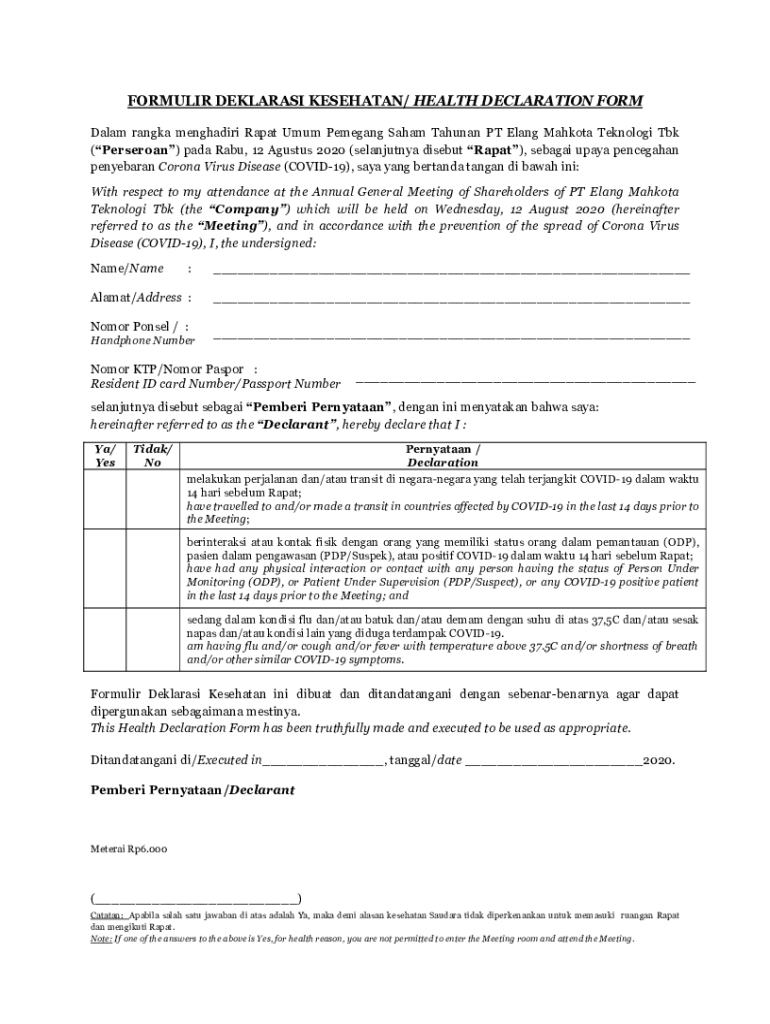 Get the free Formulir Deklarasi Kesehatan Health Declaration Form