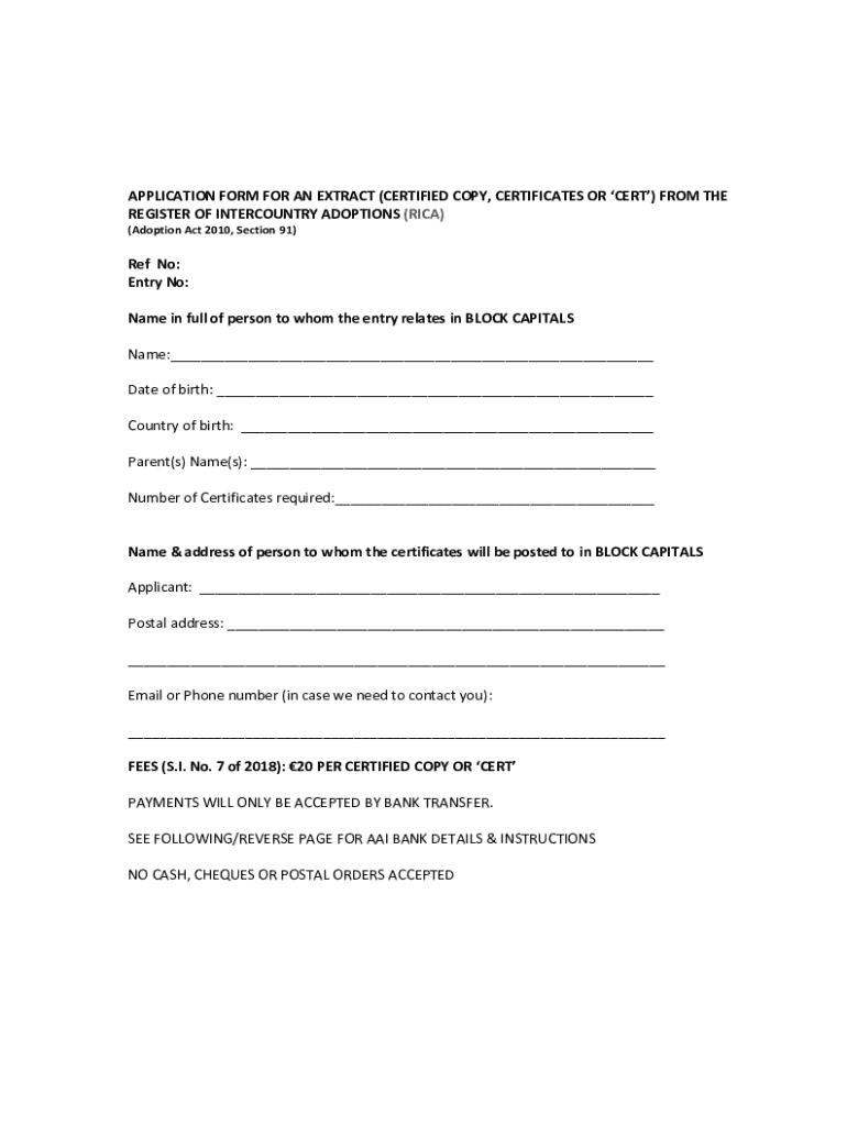 APPLICATION FORM FOR AN EXTRACT (CERTIFIED COPY, CERTIFICATES OR CERT) FROM THE REGISTER OF INTERCOUNTRY ADOPTIONS (RICH) (Adoption Act 2010, Section 91)Ref No: Entry No: Name in full of person to