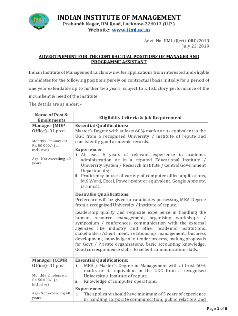 INDIAN INSTITUTE OF MANAGEMENT Armband Nagar, IIM Road, Lucknow226013 (U.P.) Website: www.iiml.ac.inAdvt. No. IIM/Rectt08C/2019 July 23, 2019, ADVERTISEMENT FOR THE CONTRACTUAL POSITIONS OF MANAGER