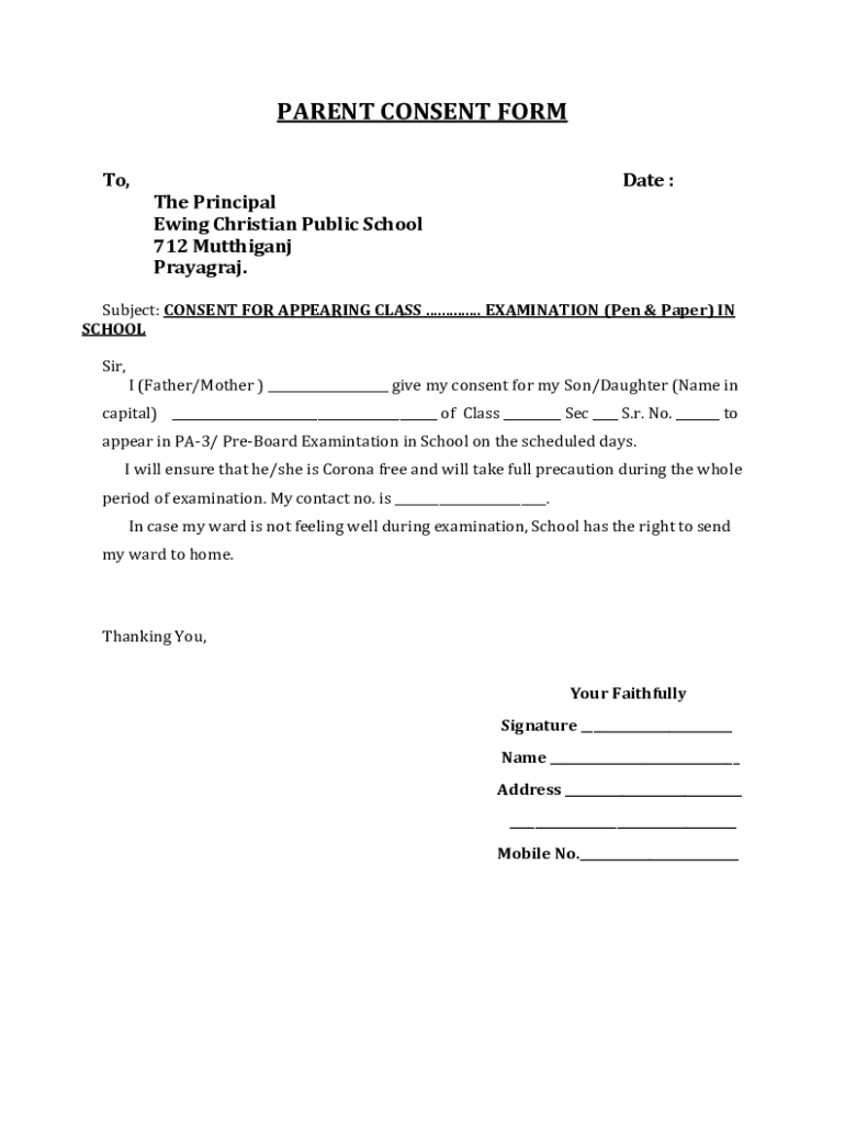 PARENT CONSENT FORM To, Date : The Principal Ewing Christian Public School 712 Mutthiganj Prayagraj. Subject: CONSENT FOR APPEARING CLASS .............. EXAMINATION (Pen & Paper) IN SCHOOL Sir, I