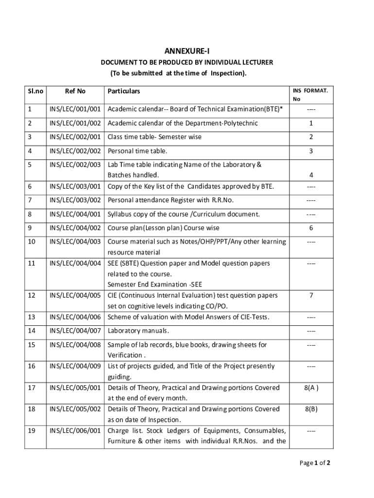 ANNEXED DOCUMENT TO BE PRODUCED BY INDIVIDUAL LECTURER (To be submitted at the time of Inspection). SL.more NoParticularsINS FORMAT. No1INS/LEC/001/001 Academic calendar Board of Technical Examination(BE)*2INS/LEC/001/002