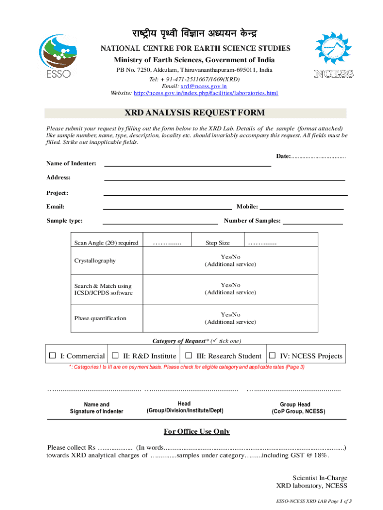 L Ex +ex Exp Ministry of Earth Sciences, Government of India PB No. 7250, Angular, Thiruvananthapuram695011, India Tel: + 914712511667/1669(3RD) Email: 3rd CESS.gov.in Website: http://ncess.gov.in/index.php/facilities/laboratories.htmlXRD