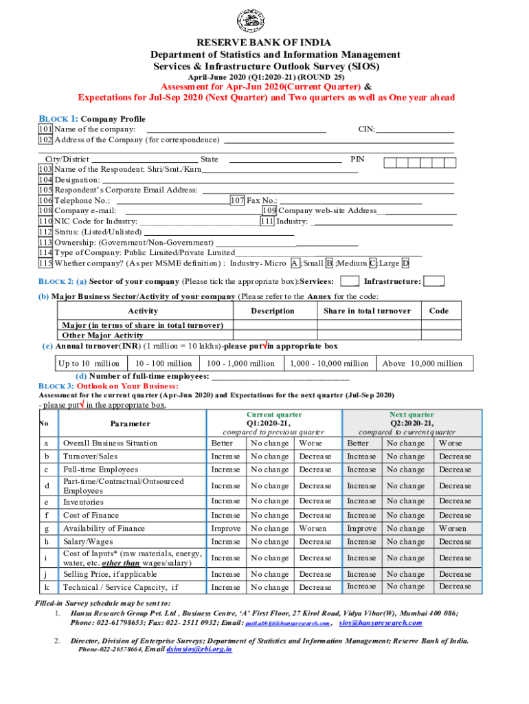 RESERVE BANK OF INDIA Department of Statistics and Information Management Services & Infrastructure Outlook Survey (SITS) April June 2020 (Q1:202021) (ROUND 25)Assessment for Apr Jun 2020(Current