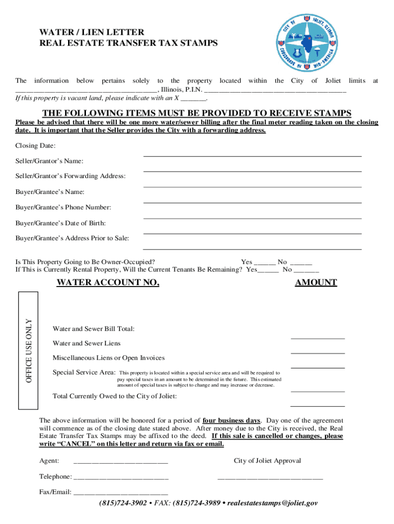 WATER / LIEN LETTER REAL ESTATE TRANSFER TAX Stamps information below pertains solely to the property located within the City of Joliet limits, Illinois, P.I.N. If this property is vacant land, please