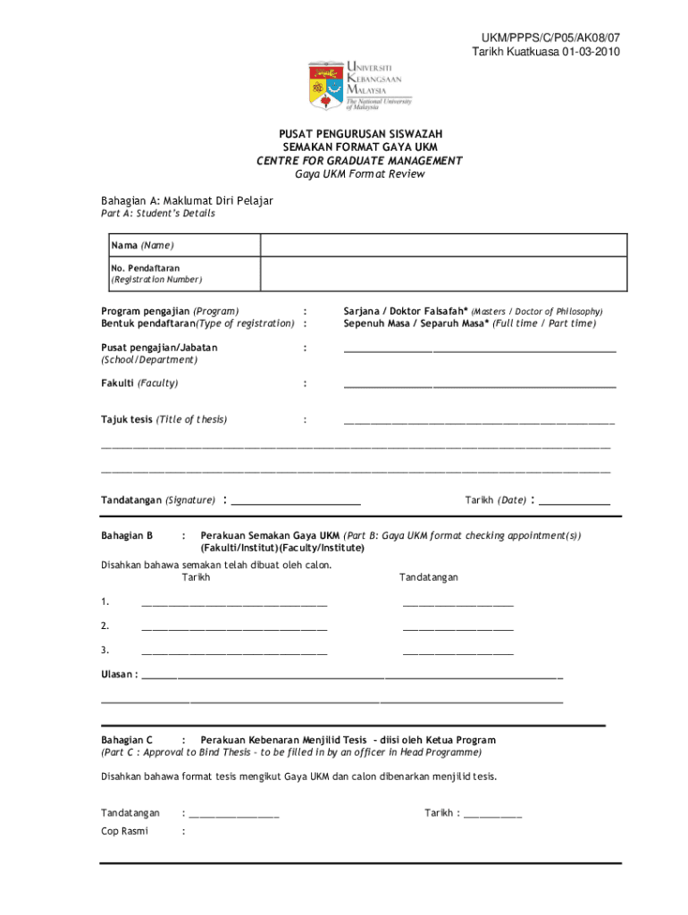 UK/PPP/C/P05/AK08/07 Parish Kuatkuasa 01032010PUSAT PENGURUSAN ISAIAH SEAMAN FORMAT MAYA UK Center FOR GRADUATE MANAGEMENT Maya UK Format Review Bahamian A: Mailman Dirt Planar Part A: Students Details