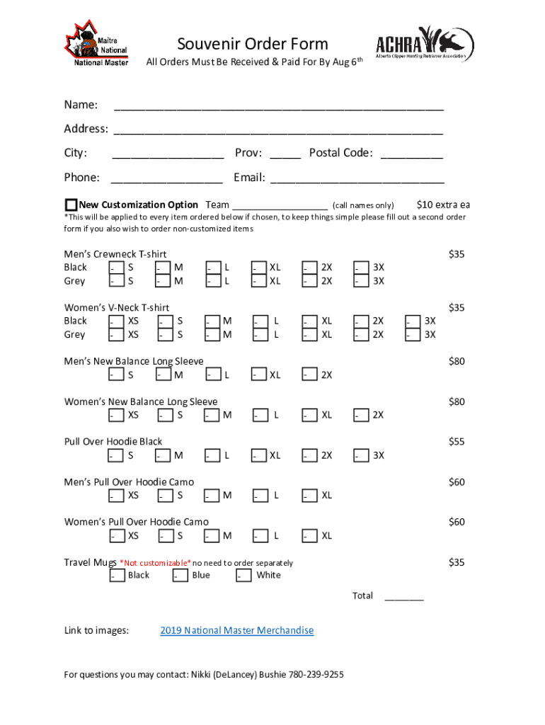 Souvenir Order Formal Orders Must Be Received & Paid For By Aug 6thName: Address: City: Prov: Postal Code: Phone: Email: New Customization Option Team (call names only)$10 extra ea×This will be applied