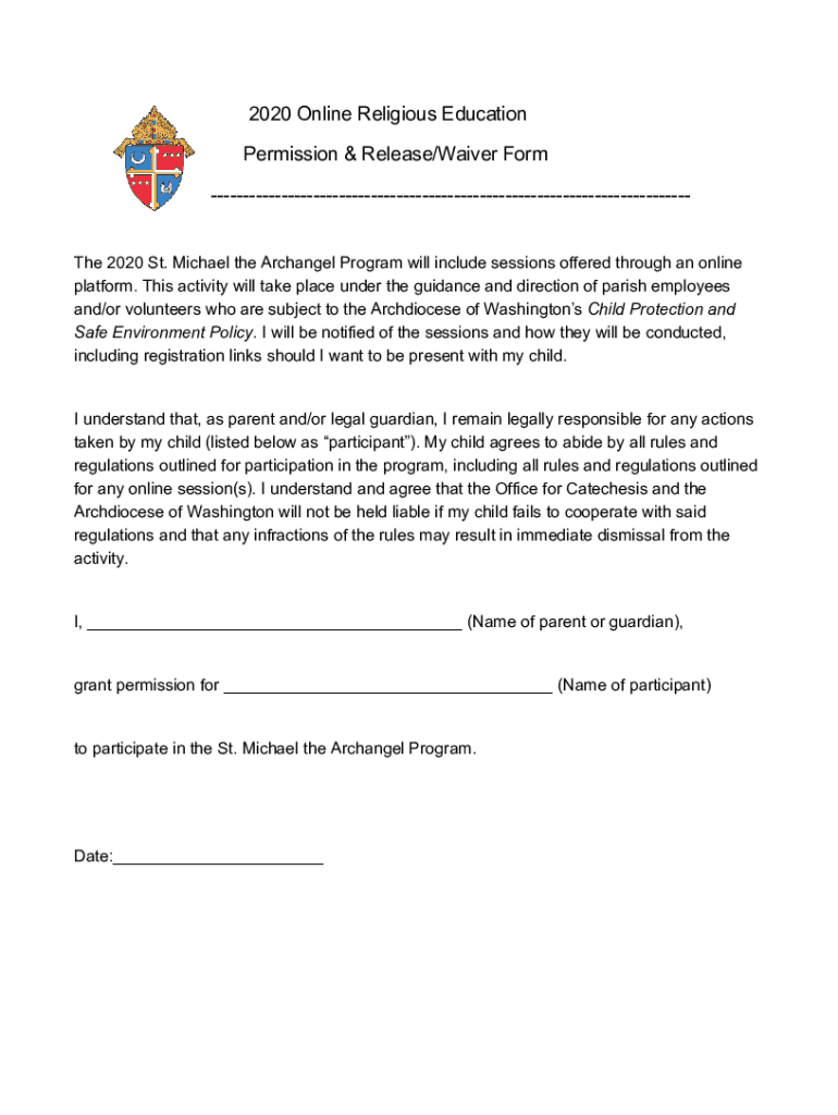 2020 Online Religious Education Permission & Release/Waiver Form The 2020 St. Michael the Archangel Program will include sessions offered through an online platform. This activity will take place