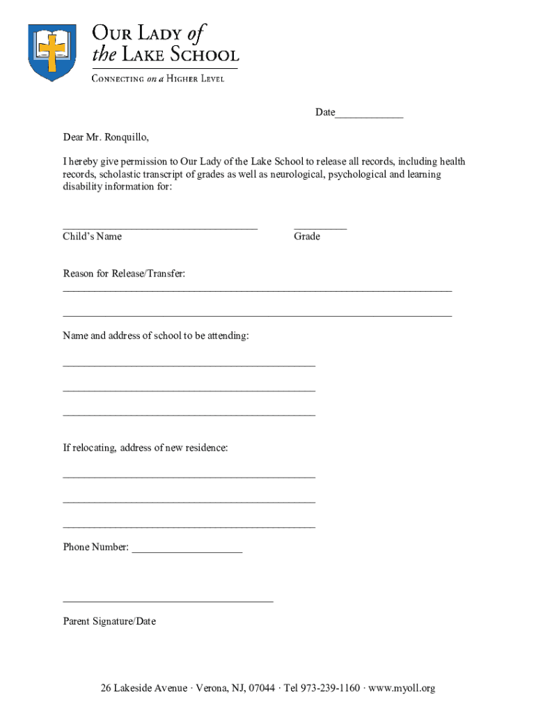 Date Dear Mr. Tranquilly, I hereby give permission to Our Lady of the Lake School to release all records, including health records, scholastic transcript of grades as well as neurological, psychological