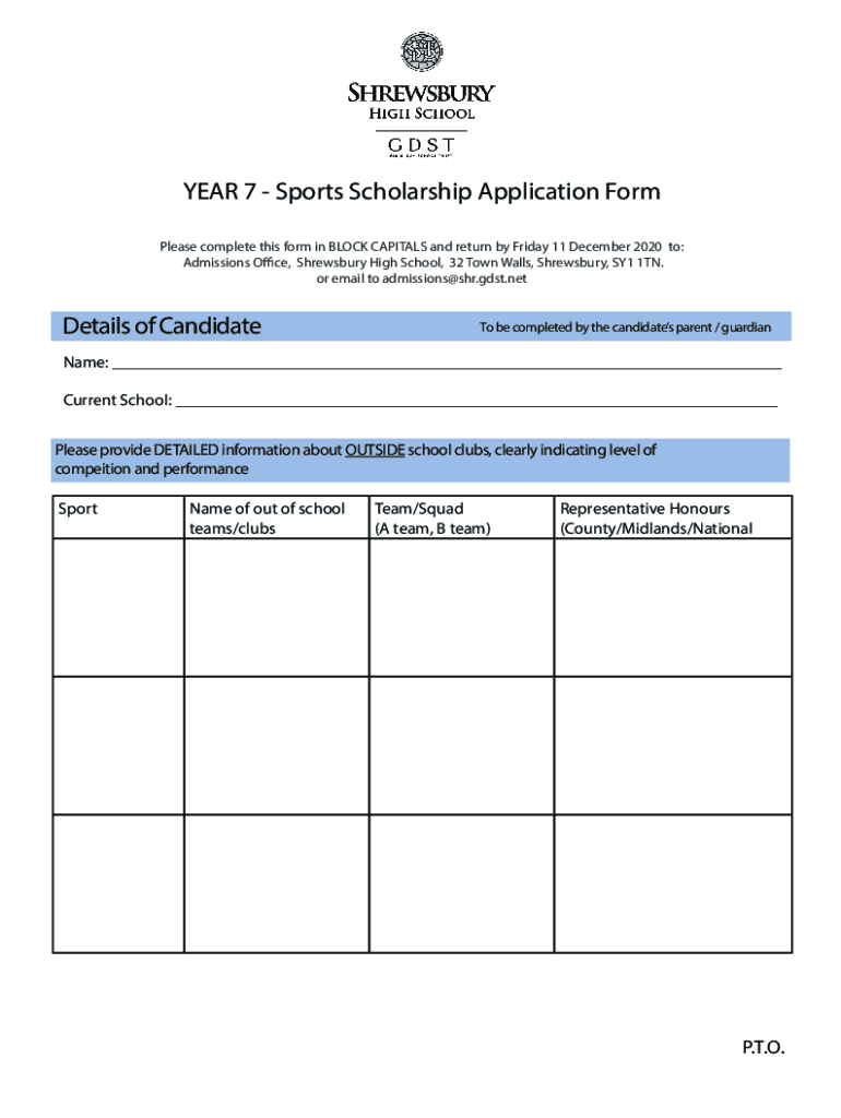 YEAR 7 Sports Scholarship Application Form Please complete this form in BLOCK CAPITALS and return by Friday 11 December 2020 to: Admissions Office, Shrewsbury High School, 32 Town Walls, Shrewsbury,