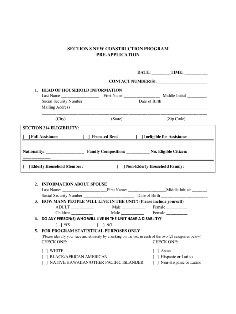 SECTION 8 NEW CONSTRUCTION PROGRAM PREAPPLICATIONDATE: TIME: CONTACT NUMBER(S): 1. HEAD OF HOUSEHOLD INFORMATION Last Name First Name Middle Initial Social Security Number Date of Birth Mailing Address