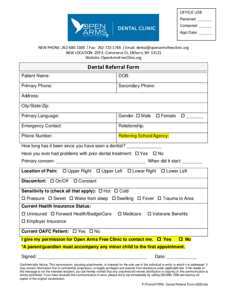 OFFICE USE Received: Contacted: Apt Date: NEW PHONE: 2626861388 / Fax: 2627231788 / Email: dental openarmsfreeclinic.org NEW LOCATION: 209 E. Commerce Ct, Elk horn, WI 53121 Website: OpenArmsFreeClinic.