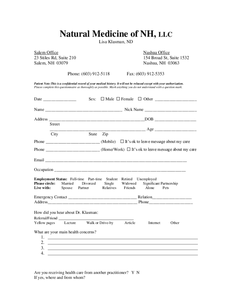 Natural Medicine of NH, LLC Lisa Klansman, ND Salem Office 23 Stiles Rd, Suite 210 Salem, NH 03079Nashua Office 154 Broad St, Suite 1532 Nashua, NH 03063Phone: (603) 9125118Fax: (603) 9125353Patient