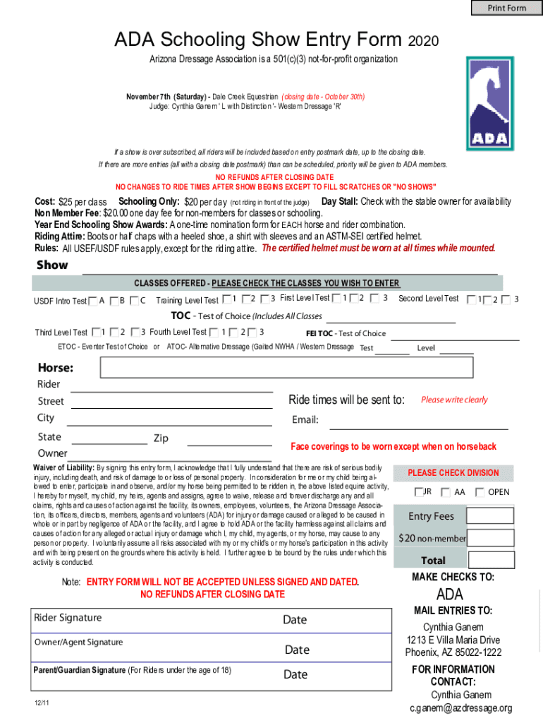 Print Form ADA Schooling Show Entry Form 2020 Arizona Dressage Association is a 501(c)(3) notforprofit organization November 7th (Saturday) Dale Creek Equestrian (closing date October 30th) Judge:
