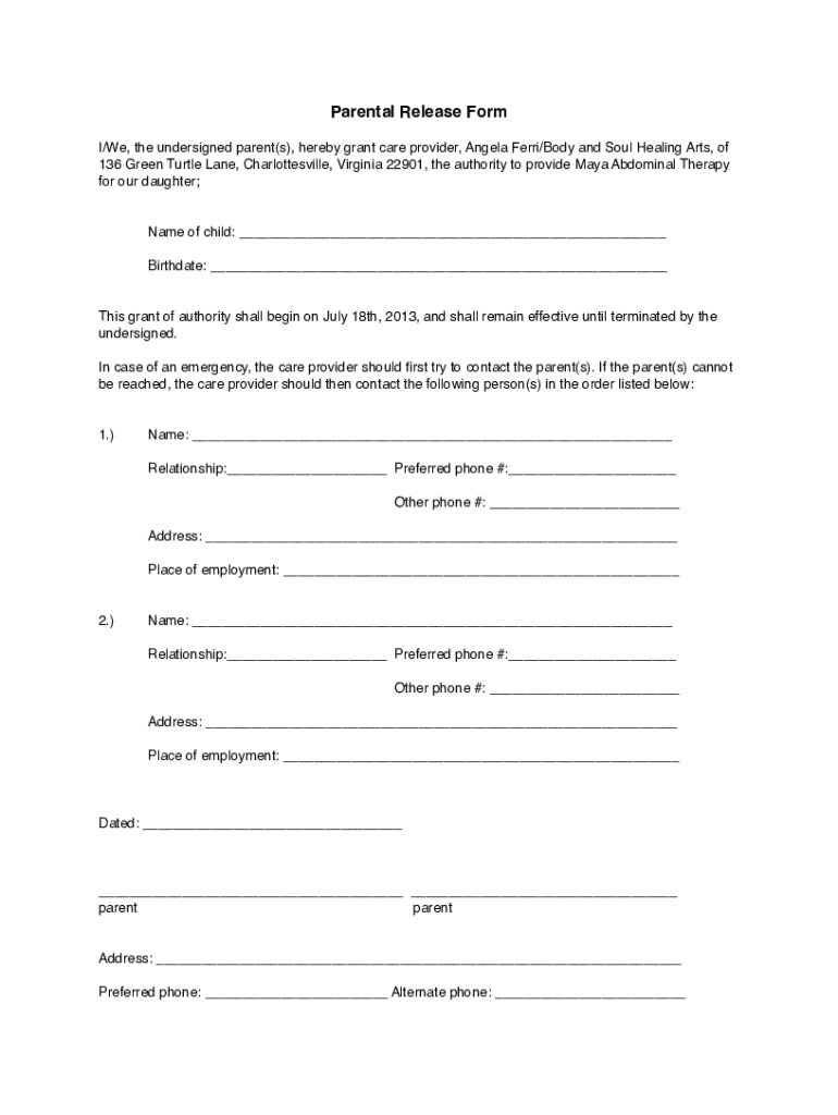 Parental Release Form I/We, the undersigned parent(s), hereby grant care provider, Angela Ferry/Body and Soul Healing Arts, of 136 Green Turtle Lane, Charlottesville, Virginia 22901, the authority