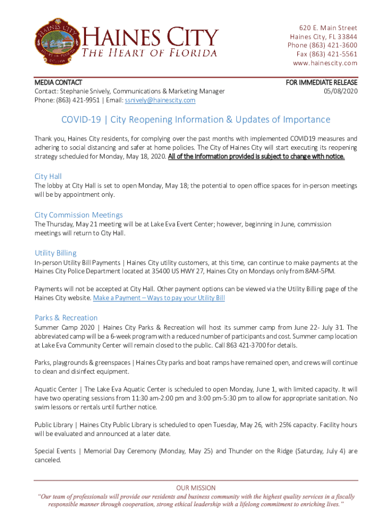 620 E. Main Street Haines City, FL 33844 Phone (863) 4213600 Fax (863) 4215561 www.hainescity.com MEDIA CONTACT: Stephanie Snidely, Communications & Marketing Manager Phone: (863) 4219951 Email: snidely