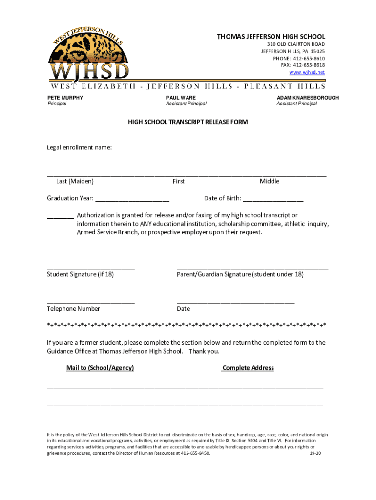 THOMAS JEFFERSON HIGH SCHOOL 310 OLD CLINTON ROAD JEFFERSON HILLS, PA 15025 PHONE: 4126558610 FAX: 4126558618 www.wjhsd.netPETE MURPHY PrincipalPAUL WARE Assistant PrincipalADAM KNARESBOROUGH Assistant