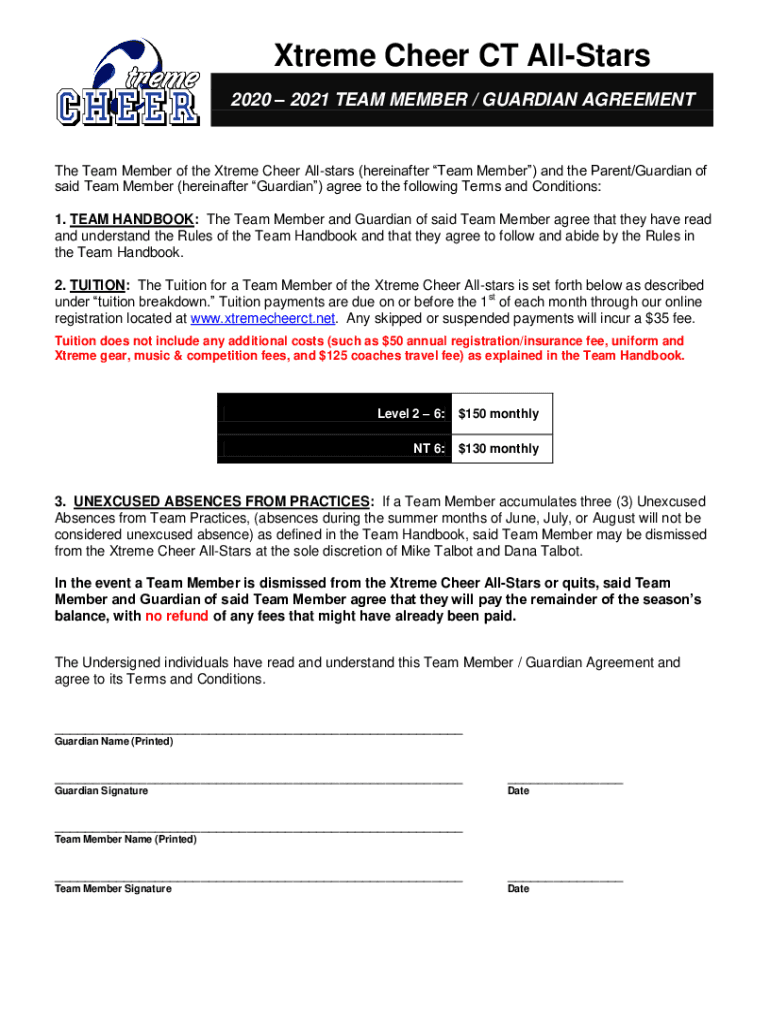 Extreme Cheer CT Altars 2020 2021 TEAM MEMBER / GUARDIAN Agreement Team Member of the Extreme Cheer All stars (hereinafter Team Member) and the Parent/Guardian of said Team Member (hereinafter Guardian)