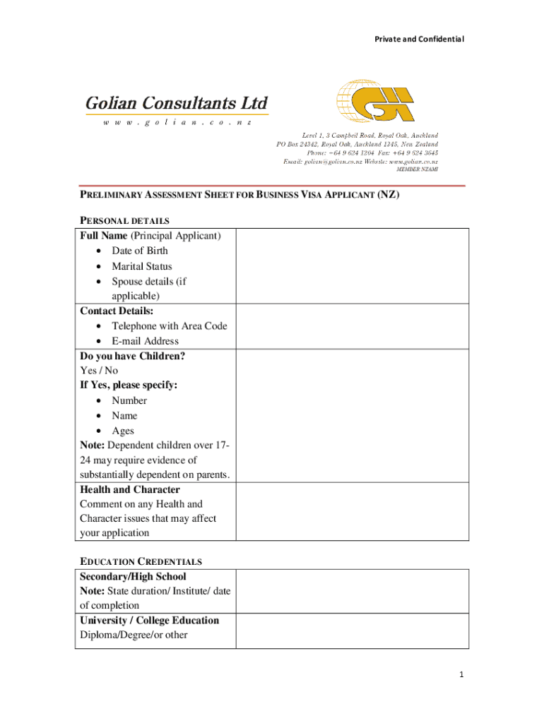 Private and ConfidentialPRELIMINARY ASSESSMENT SHEET FOR BUSINESS VISA APPLICANT (NZ) PERSONAL DETAILS Full Name (Principal Applicant) Date of Birth Marital Status Spouse details (if applicable) Contact