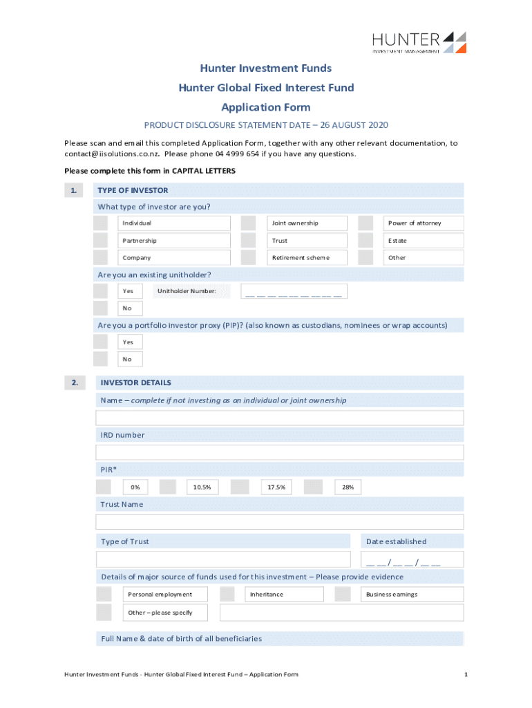 Hunter Investment Funds Hunter Global Fixed Interest Fund Application Form PRODUCT DISCLOSURE STATEMENT DATE 26 AUGUST 2020 Please scan and email this completed Application Form, together with any
