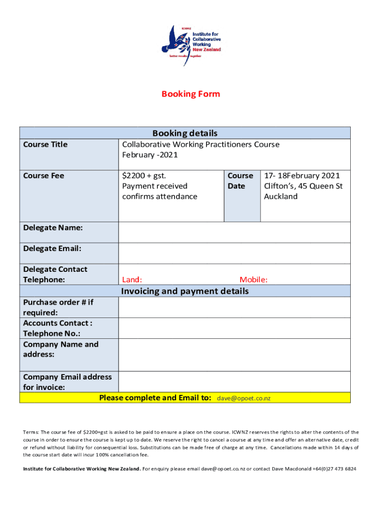 Booking ORM Bookkingdetaails COU urseTitleCou refer DellegateName: Delegate mail: Delegation intact Telephone:CollaaborativeWorkingP PractitioneersCoursee Febrruary$20221220 00+GST. Course 1718Februaary2021