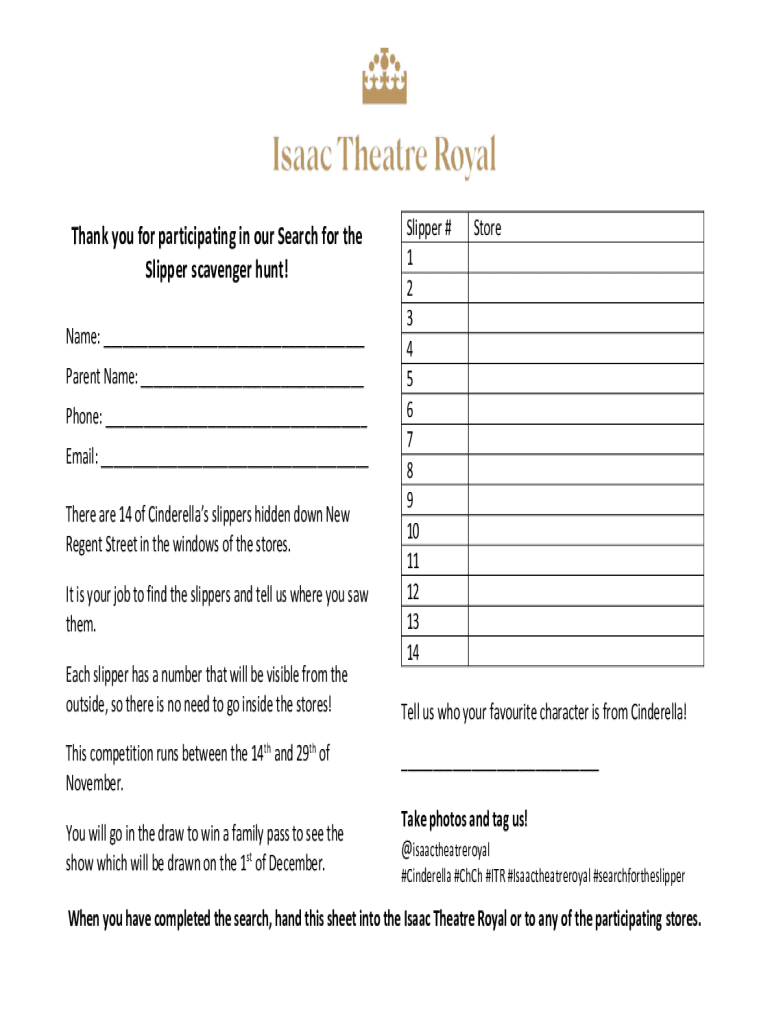 Thank you for participating in our Search for the Slipper scavenger hunt! Name: Parent Name: Phone: Email: There are 14 of Cinderellas slippers hidden down New Regent Street in the windows of the