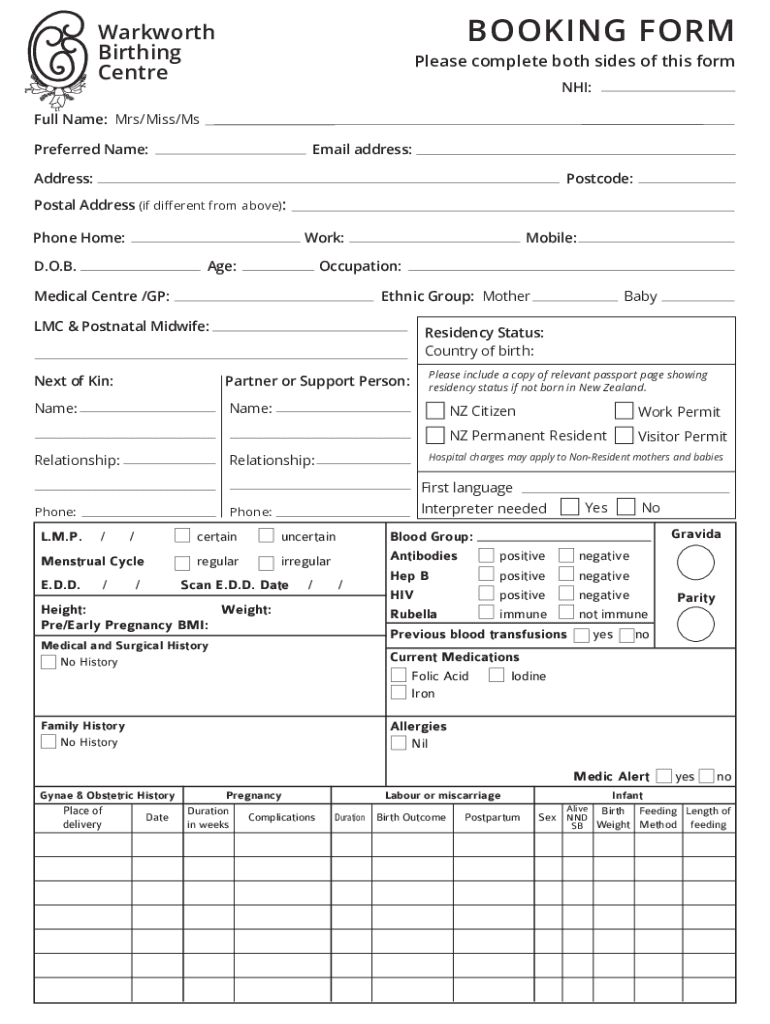 BOOKING FORMWarkworth Birthing CentrePlease complete both sides of this form NHS:Full Name: Mrs/Miss/Ms Preferred Name:Email address:Address:Postcode:Postal Address (if different from above): Mobile:Work:Phone