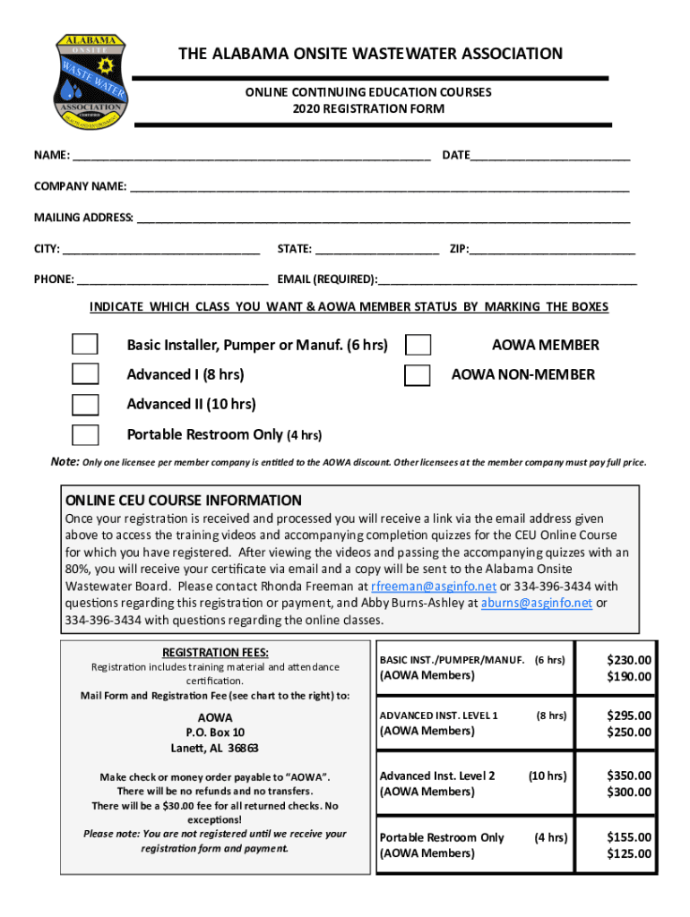 THE ALABAMA ONSITE WASTEWATER ASSOCIATION ONLINE CONTINUING EDUCATION COURSES 2020 REGISTRATION FORM NAME: DATE COMPANY NAME: MAILING ADDRESS: CITY: STATE: ZIP: PHONE: EMAIL (REQUIRED): INDICATE WHICH