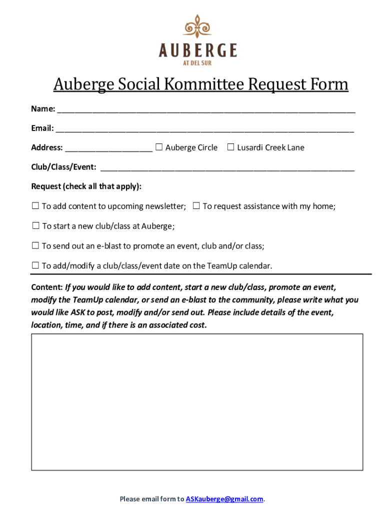 Get the free Auberge Social Kommittee Request Form