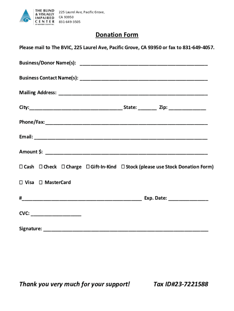 225 Laurel Ave, Pacific Grove, CA 93950 8316493505Donation Form Please mail to The BRIC, 225 Laurel Ave, Pacific Grove, CA 93950 or fax to 8316494057. Business/Donor Name(s): Business Contact Name(s):