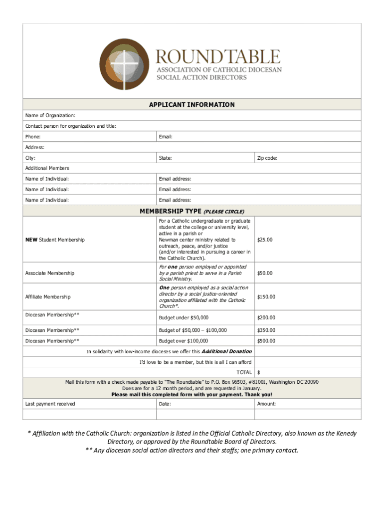 Roundtable membership application form is a document that individuals or organizations fill out to apply for membership in a roundtable group.