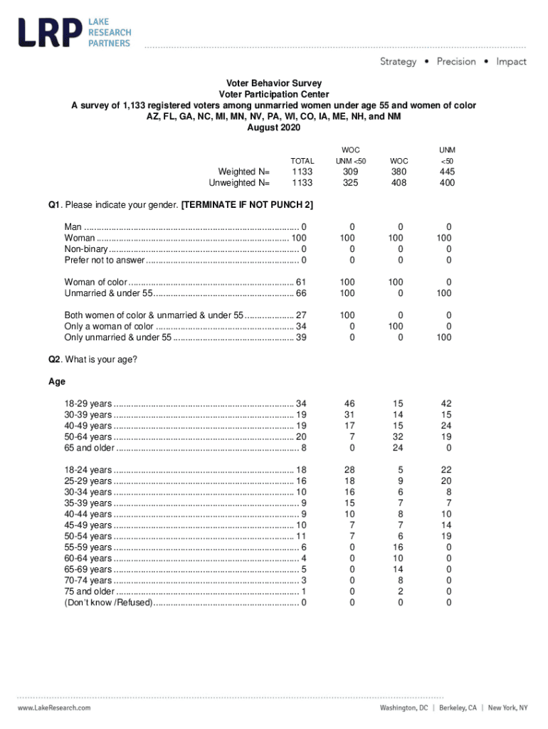 Voter Behavior Survey Voter Participation Center A survey of 1,133 registered voters among unmarried women under age 55 and women of color AZ, FL, GA, NC, MI, MN, NV, PA, WI, CO, IA, ME, NH, and NM