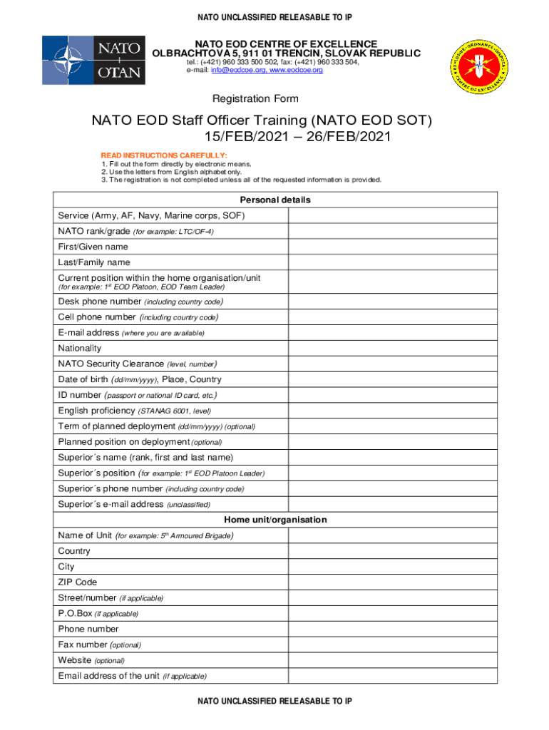 NATO UNCLASSIFIED RELEASABLE TO IP NATO EOD Center OF EXCELLENCE OLBRACHTOVA 5, 911 01 Trenches, SLOVAK REPUBLIC tel.: (+421) 960 333 500 502, fax: (+421) 960 333 504, email: info Roscoe.org, www.eodcoe.orgRegistration