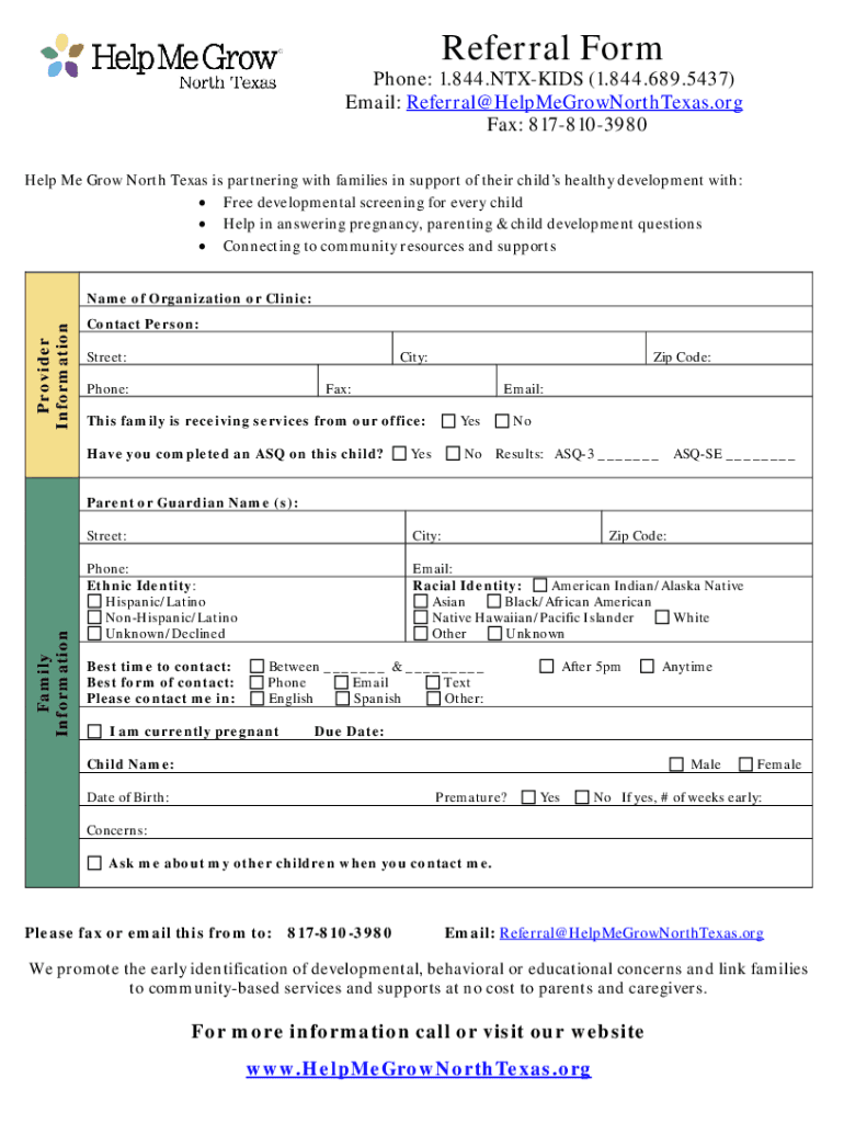 Referral Hormone: 1.844.KIDS (1.844.689.5437) Email: Referral HelpMeGrowNorthTexas.org Fax: 8178103980 Help Me Grow North Texas is partnering with families in support of their children healthy development