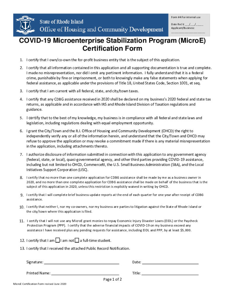 Form #4 For internal use Date Recd / / Applicant/Business: COVID-19 Microenterprise Stabilization Program (Micro) Certification Form 1. I certify that I own/crown the for profit business entity that