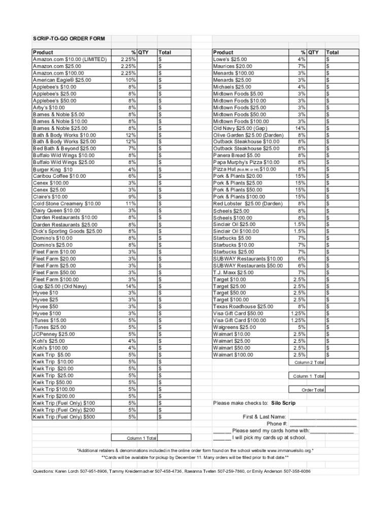 SCRIPT ORDER FORM Product Amazon.com $10.00 (LIMITED) Amazon.com $25.00 Amazon.com $100.00 American Eagle $25.00 Applebee's $10.00 Applebee's $25.00 Applebee's $50.00 Arby's $10.00 Barnes & Noble