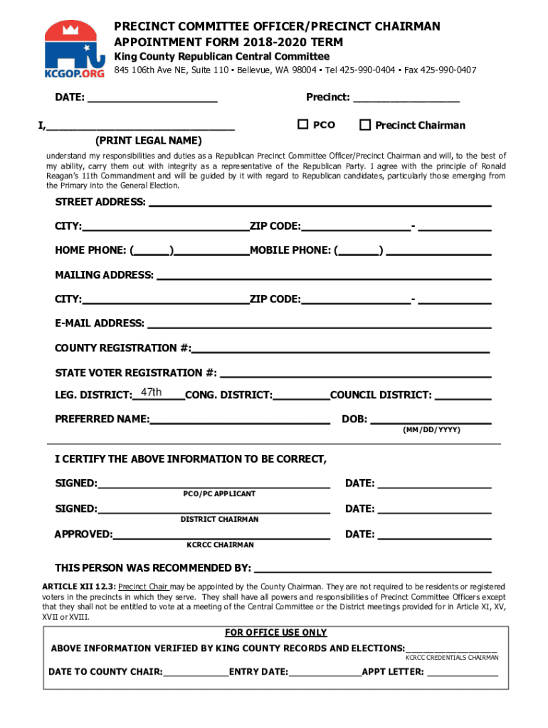 PRECINCT COMMITTEE OFFICER/PRECINCT CHAIRMAN APPOINTMENT FORM 20182020 TERM King County Republican Central Committee845 106th Ave NE, Suite 110 Bellevue, WA 98004 Tel 4259900404 Fax 4259900407DATE:Precinct: