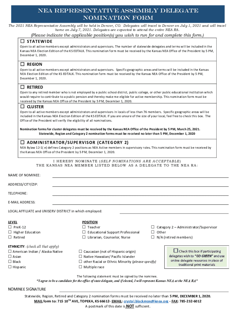 Get the free NEA REPRESENTATIVE ASSEMBLY DELEGATE NOMINATION FORM