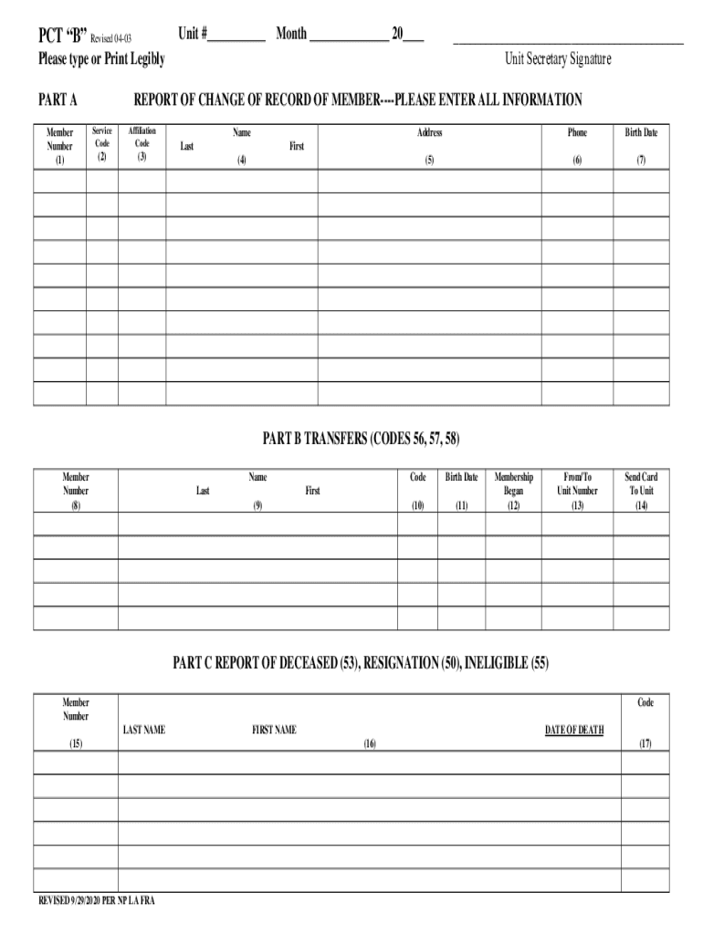 Unit Secretary SignatureUnit # Month 20 PCT B Revised 0403 Please type or Print Legibly PART A Member Number (1)REPORT OF CHANGE OF RECORD OF MEMBERPLEASE ENTER ALL INFORMATION Service CodeAffiliation