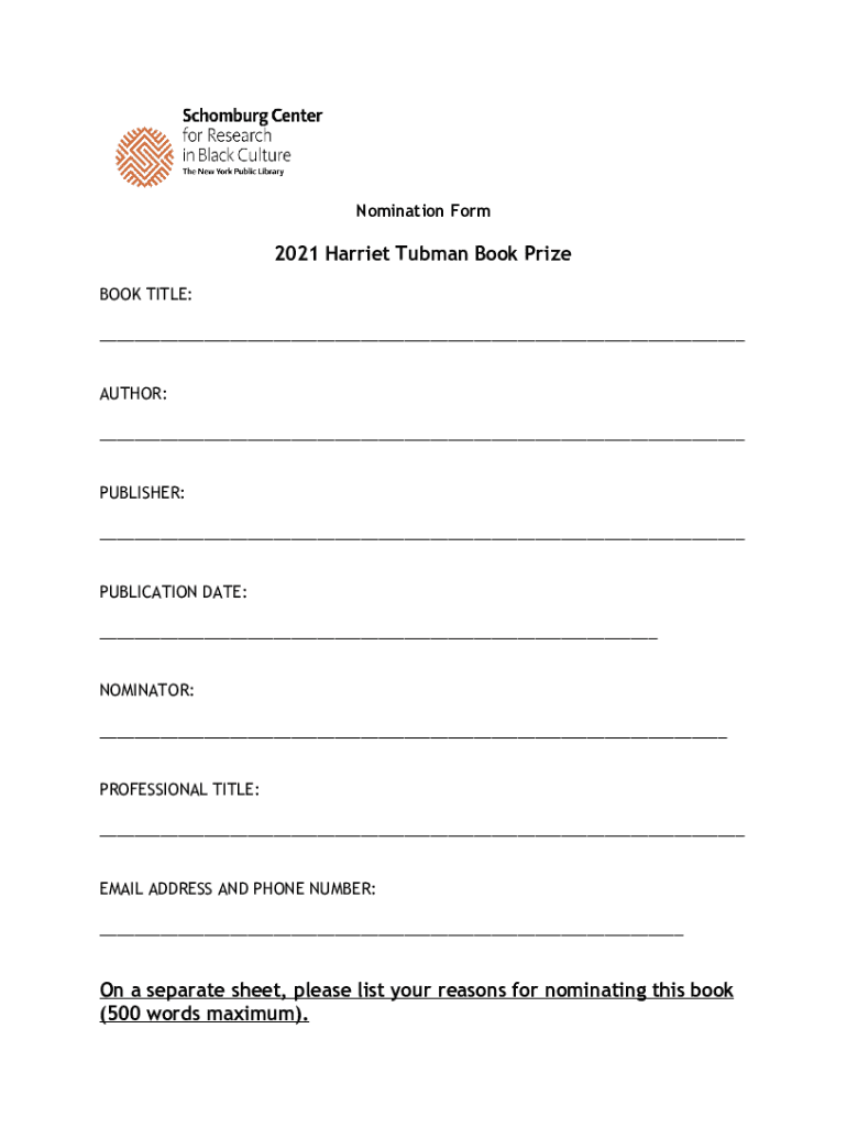 Nomination Form 2021 Harriet Tubman Book Prize BOOK TITLE: AUTHOR: PUBLISHER: PUBLICATION DATE: NOMINATOR: PROFESSIONAL TITLE: EMAIL ADDRESS AND PHONE NUMBER: On a separate sheet, please list your