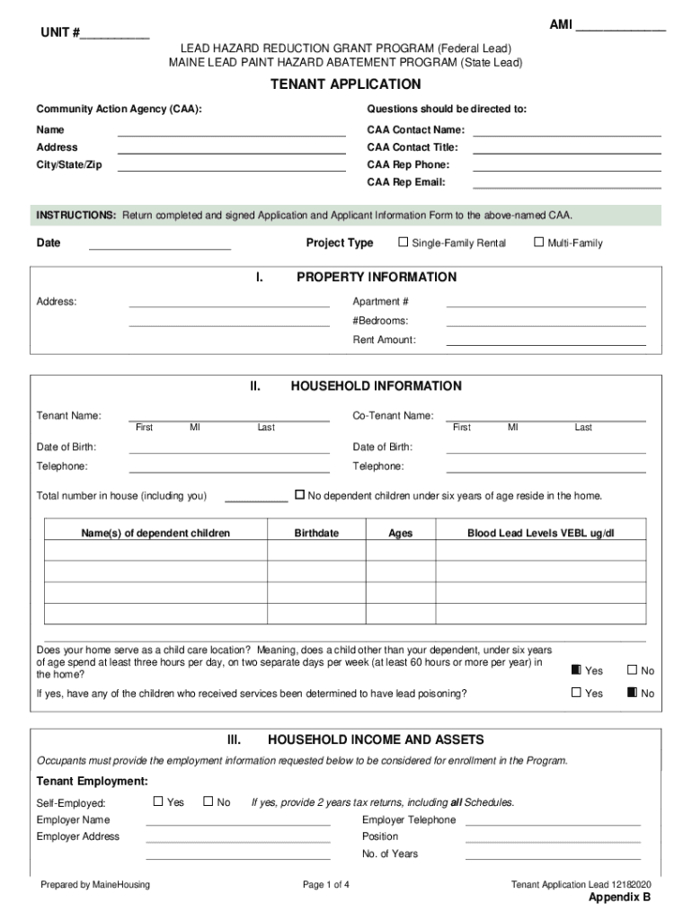 AMI UNIT # LEAD HAZARD REDUCTION GRANT PROGRAM (Federal Lead) MAINE LEAD PAINT HAZARD ABATEMENT PROGRAM (State Lead)TENANT APPLICATION Community Action Agency (CAA):Questions should be directed to:Name