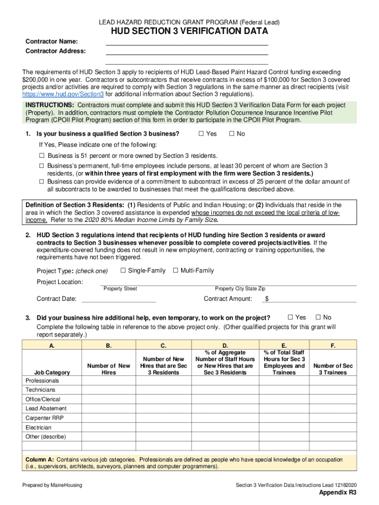 LEAD HAZARD REDUCTION GRANT PROGRAM (Federal Lead)HUD SECTION 3 VERIFICATION DATA