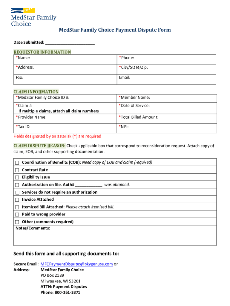 Get the free Claims Payment Dispute - MedStar Family Choice