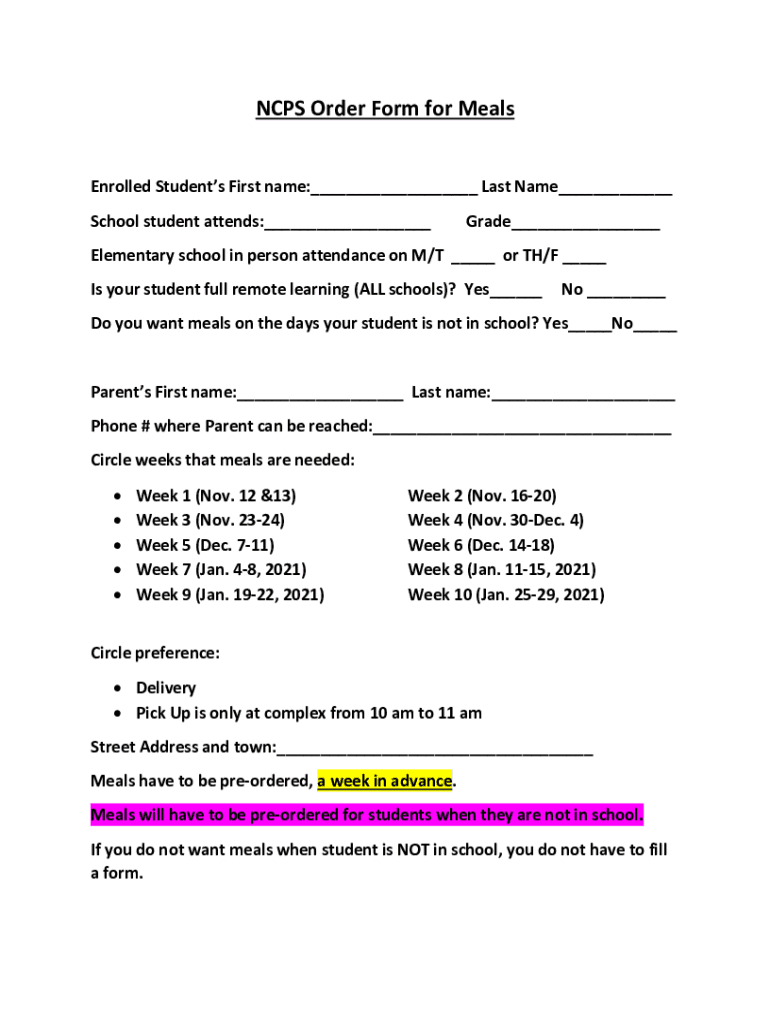 NPS Order Form for Meals Enrolled Students First name: Last Name School student attends: Grade Elementary school in person attendance on M/T or TH/F Is your student full remote learning (ALL schools)?