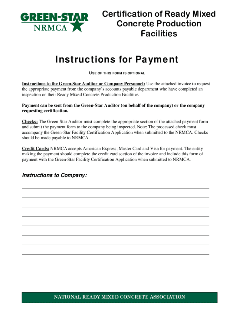 The NRMCA Green-Star Payment Formdoc is needed by individuals or companies who are making payments related to NRMCA Green-Star certification, licensing, or other services provided by the National Ready Mixed Concrete Association.