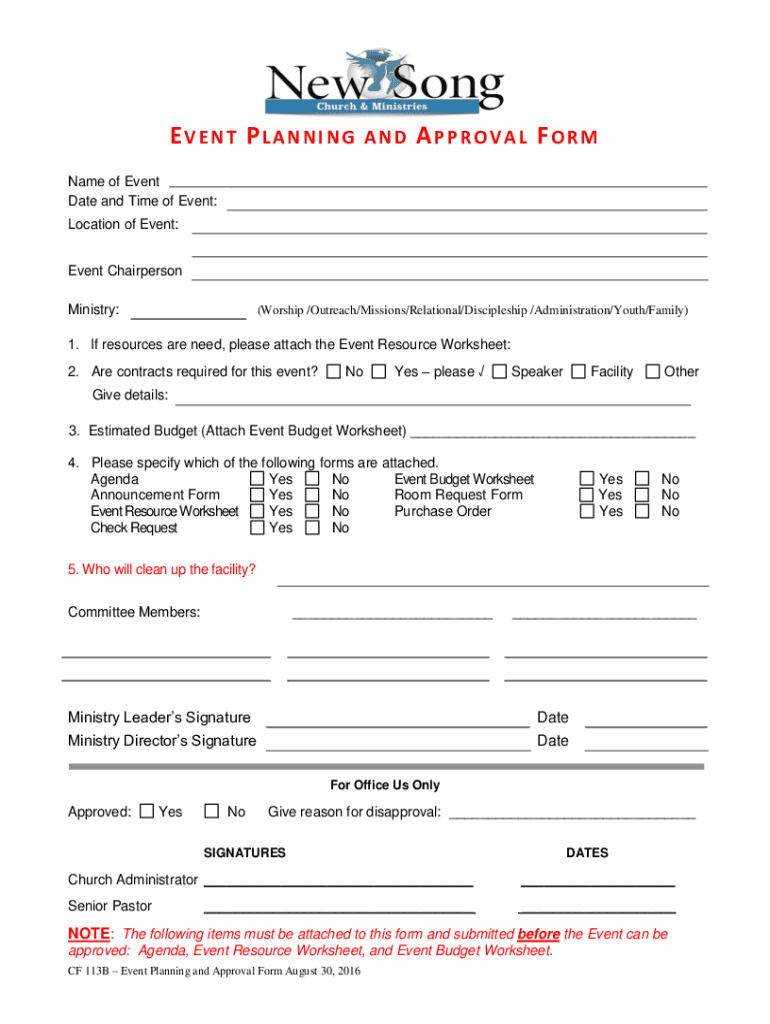EVENT PLANNINGANDAPPROVAL Forename of Event Date and Time of Event: Location of Event: Point Contact Event of Chairperson (name & phone):Ministry:(Worship /Outreach/Missions/Relational/Discipleship