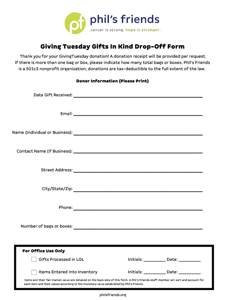 Giving Tuesday Gifts In Kind Drop-off Form Thank you for your Giving Tuesday donation! A donation receipt will be provided per request. If there is more than one bag or box, please indicate how many